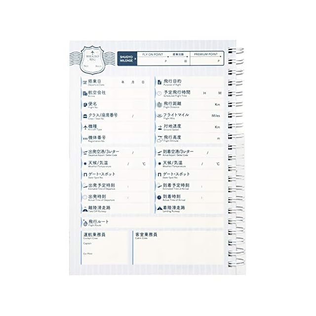ログページには、基本的なフライト情報やマイレージプログラムの累積ポイント・回数などの記入欄を網羅、60レグまで記録できます。