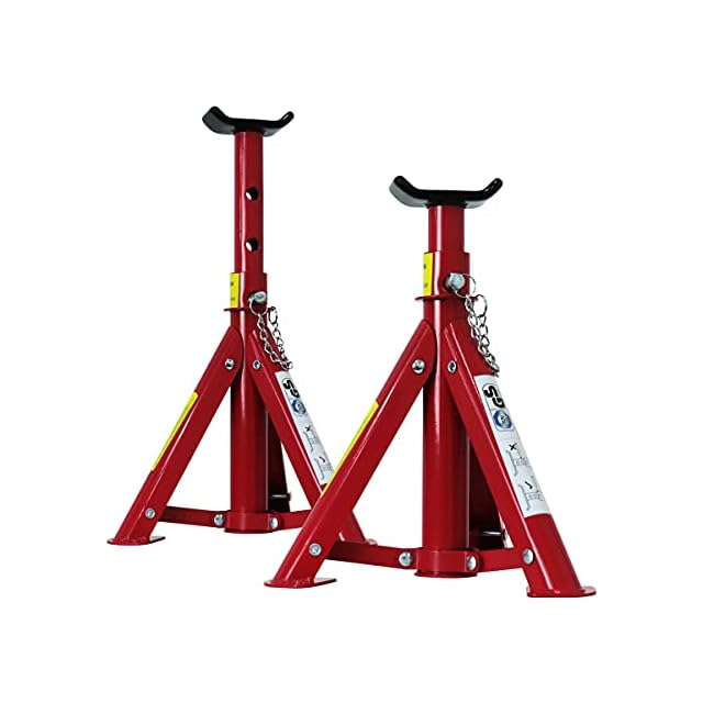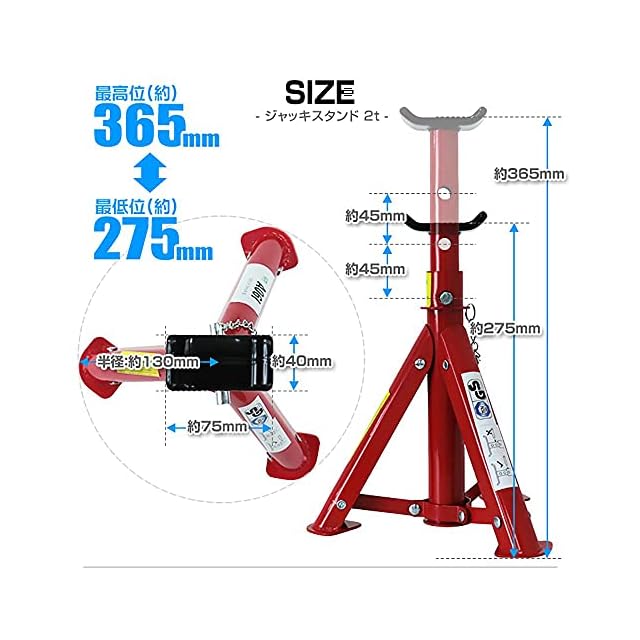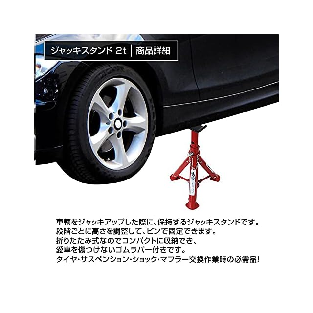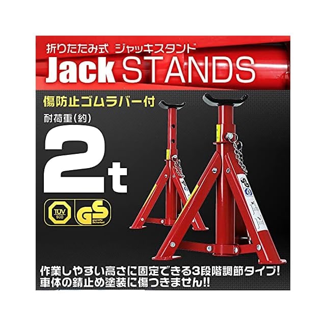 車輌をジャッキアップした際に保持するジャッキスタンドです。<br>段階ごとに高さを調整してピンで固定できます。<br>折りたたみ式なのでコンパクトに収納でき、愛車を傷つけないゴムラバー付きです。<br><br>タイヤ・サスペンション・ショック・マフラー交換作業時の必需品!<br><br>【商品仕様】<br>能力:2t<br>高さ調節:3段階<br>・最低位(約):275mm<br>・最高位(約):365mm<br>重量(約):3kg(2基)<br><br>【注意事項】<br>・絶対にジャッキの呼び荷重を超えた荷物を持ち上げないでください。<br>・ジャッキの底面は常に固い水平な平面の上に置いてご使用ください。<br>・当商品は入荷の時期によりカラー、仕様などが変更される場合があります。ご了承下さい(色指定はできません。)。<br><br>