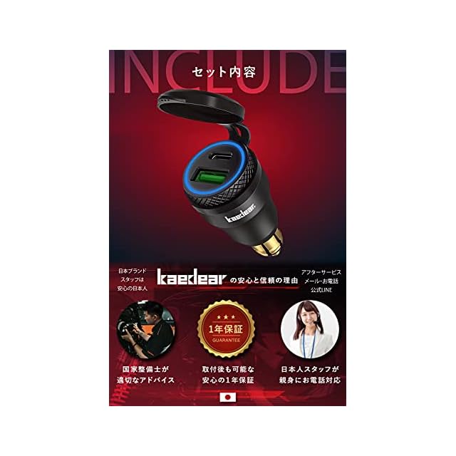 【2ポート急速電源】 現行製品に汎用性が高いUSB電源とUSB-Cポートの2ポート搭載したデュアルUSBモデル。PD:30W / QC3.0:18W 合計36Wの出力はスマホの急速充電だけで無く、ドラレコからインカムまで様々なバイク用品の充電や電源にも使用できます。USBポートはストレス無いスムーズな差し心地で節度もしっかりある高精度の物を使用しております。【アルミ製コンパクト設計】 ライダー達がこよなく愛する美しい航空機アルミニウム合金を採用。コンパクトなので場所を取らずにスマートに設置いただけます。【デザイン】 4色のカラーから選べるバリエーション。エンジェルリングの間接照明で通電状態が確認できます。【DINプラグ】 輸入車などのDIN規格電源プラグで使用できるUSBシガーソケットです。通常の国産車装備のシガーソケットでは対応できません。【商品仕様】 ■本体サイズ:縦幅60mm、横幅27mm、 ■入力電圧:12V-24V ■USB出力:PD:30WQC3.0:18W ■認証:CE、FCC、ROHS ■素材:アルミニウム合金 ■セット内容:本体 ■ブランド:Kaedear(カエディア)【メーカー】 ■メーカー期間:1年(ご購入日と同日が期限) カエディアではお客様にご満足頂ける様、販売後もサポートさせて頂きます。 商品のご不明な点はもちろん、バイクへのお取り付けに関するご相談は、国家整備資格を保有したスタッフがおりますので、専門知識に対しても的確に対応させて頂きます。 万一、製品不良に起因する不具合と診断される場合は、弊社のメーカー規定に基づき審議させて頂き、メーカーによる無償での修理、交換を行わせて頂きます。業務用に使用される際は、メーカー期間を半分の期間とさせて頂きます(例:メーカー期間が1年の場合、6ヶ月となり、ご購入日の月に6ヶ月を加算した同日が期限)詳細は公式サイト内メーカー規定をご覧下さい。 お取り付け後、ご使用後でも、対応させて頂きます。日本メーカーとして、おもてなしの心で対応致します。先ずはお気軽にご相談下さい。