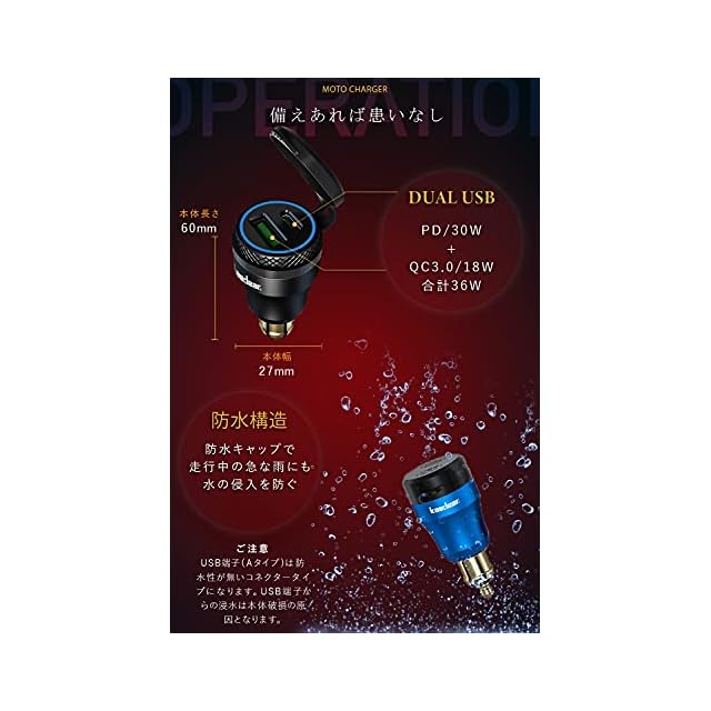 【2ポート急速電源】 現行製品に汎用性が高いUSB電源とUSB-Cポートの2ポート搭載したデュアルUSBモデル。PD:30W / QC3.0:18W 合計36Wの出力はスマホの急速充電だけで無く、ドラレコからインカムまで様々なバイク用品の充電や電源にも使用できます。USBポートはストレス無いスムーズな差し心地で節度もしっかりある高精度の物を使用しております。