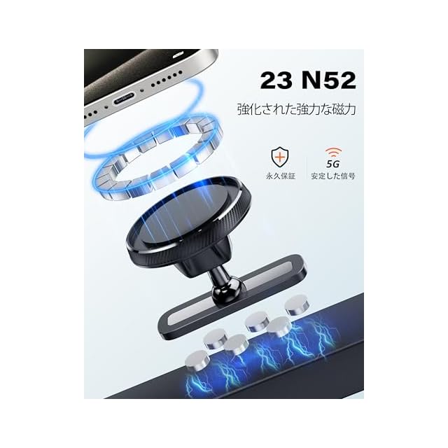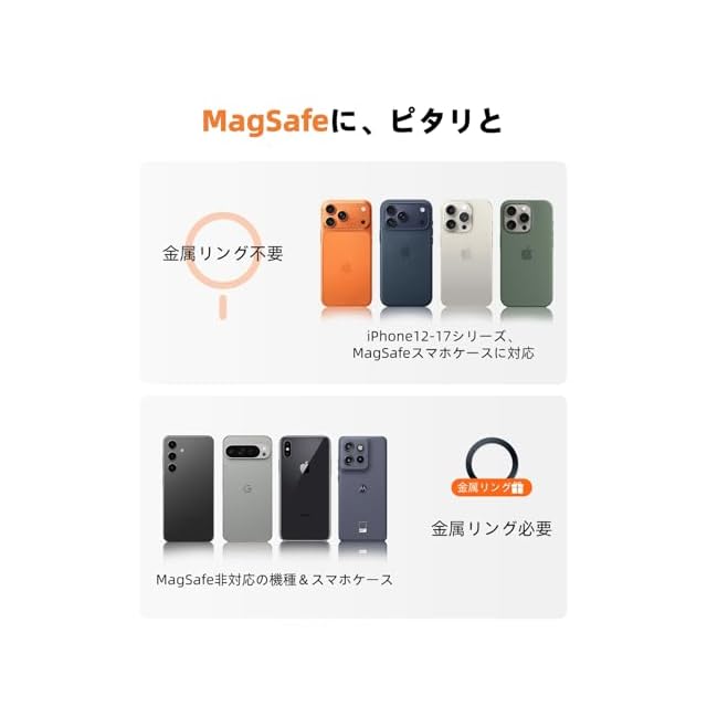【広範な互換性】MagSafe対応の強力N52マグネット×17個搭載、iPhone 12〜16シリーズに完璧対応し、MagSafe非対応のスマホにも金属リング1つで簡単に装着可能で(付属品に含む)、ほぼ全機種に対応しています。