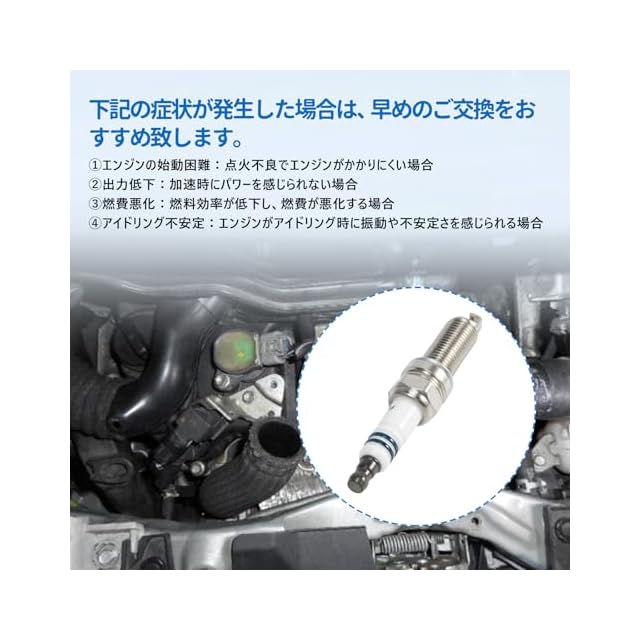 【劣化現象】下記の症状が発生した場合は、早めのご交換をおすすめ致します。①エンジンの始動困難:点火不良でエンジンがかかりにくい場合②出力低下:加速時にパワーを感じられない場合③燃費悪化:燃料効率が低下し、燃費が悪化する場合④アイドリング不安定:エンジンがアイドリング時に振動や不安定さを感じられる場合