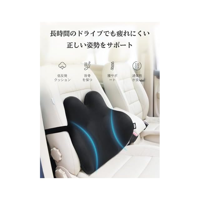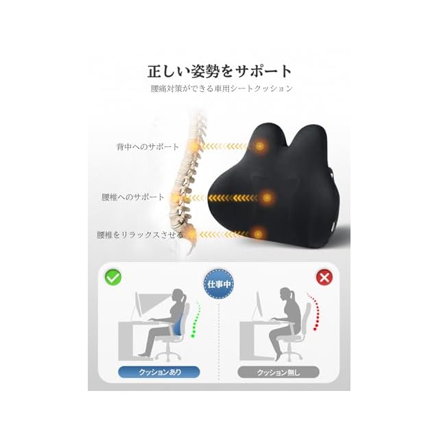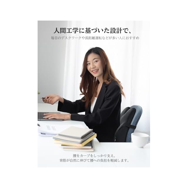 人間工学に基づく:腰をカーブをしっかり支え、背筋が自然に伸びて腰への負担を軽減します。長距離を車での移動時に使用するだけではなく、長時間のデスクワークなどにも使えます。長時間椅子に座って作業することが多い方におすすめのランバーサポート。