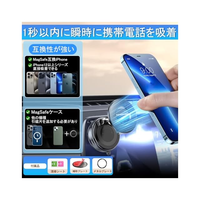 【片手で操作、幅広い互換性】従来の車載携帯電話ホルダーと違い、マグネット真空吸着携帯電話ホルダーは携帯電話をホルダーに押し付けるだけで簡単に固定できます。操作はとても簡単で、片手で素早く取り付け、取り外しができます。ダッシュボードやフロントガラス、ディスプレイなどの平らな面に取り付けることができ、99%の車種に対応しています。 車内だけでなく、自宅やオフィスなど、携帯電話ホルダーがあればどこでも使えるスマートフォンカーマウントです。幅広い機種に対応し、スマートフォンの99%に対応:iPhone 12/13/14/15/16シリーズと公式認定を受けたMagSafeケースをそのまま装着可能。金属リングを取り付けるだけで、他の機種も使用できます。この多用途で便利なカーアクセサリーホルダーは、あなたの日常生活をより快適にします!