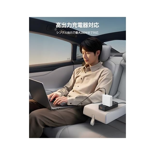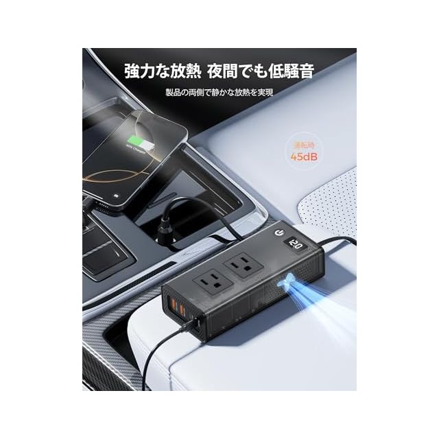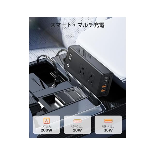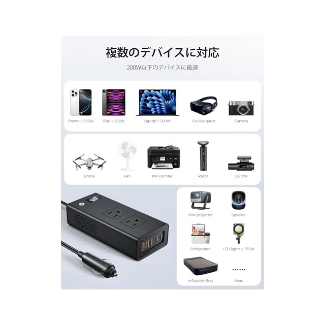 【200W シガーソケット コンセント】車載インバーターには、日本の標準ACソケット2つとUSB A充電ポート2つ、USB C充電ポート2つが装備されており、DC 12VからAC 110Vへのコンバーターは最大200Wの電力を供給でき、ノートパソコン、タブレット、携帯電話、iPad、その他の電子機器の充電に最適です。