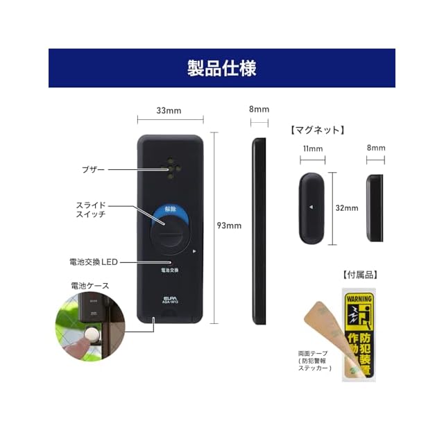■本体サイズ(約):幅33x高さ93x厚さ8(mm) ■マグネットサイズ(約):幅11x高さ32x厚さ8(mm) ■重量:約26g(電池除く、マグネット含む)