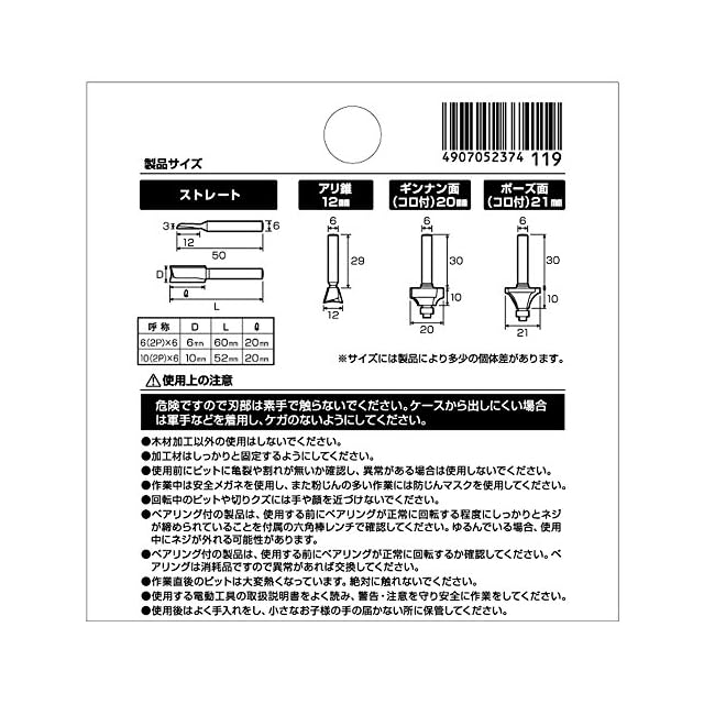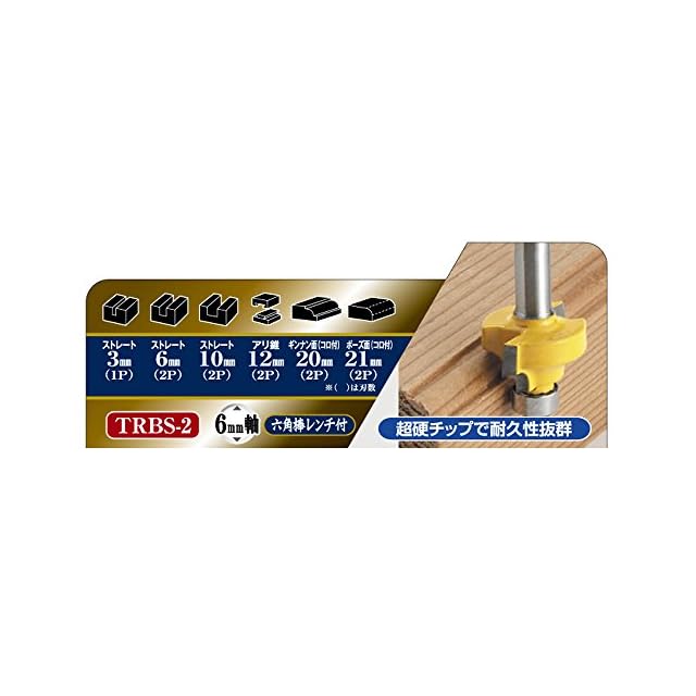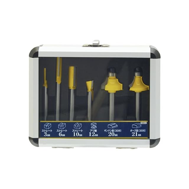 セット内容:ストレート3mm(1P)、ストレート6mm(2P)、ストレート10mm(2P)、アリ錐12mm(2P)、ギンナン面(コロ付)20mm(2P)、ボーズ面(コロ付)21mm(2P) ※( )は刃数