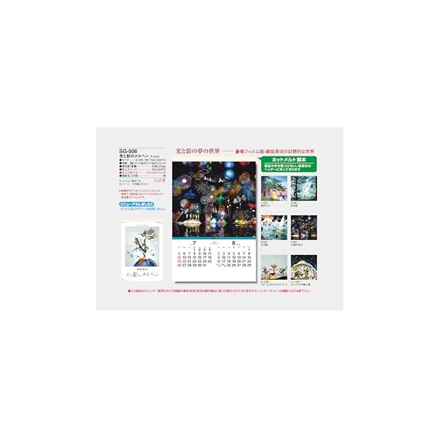 光と影のメルヘン<br> 豪奢フィルム判 藤城清治の幻想的な世界感が表現されたカレンダー。<br> <br> 品番:SG-508 <br> サイズ:B/2切・7枚(755×504mm)<br> 用紙:表紙マットコート110㎏・本文ケント110㎏ポリエステルフィルム<br>