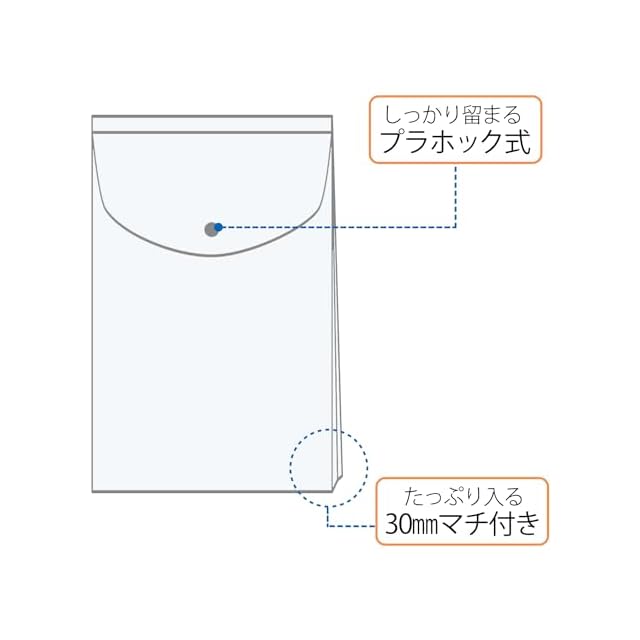 「わける」「しまう」「はこぶ」「わたす」「まもる」の5つの使い方ができる、耐久性のあるファイル。30mmのたっぷり収納できるマチが付いて、筆記具・文具類も収納・携帯が可能。