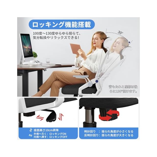 商品名:HLIFE オフィスチェア デスクチェア 人間工学 テレワークチェア 疲れない 椅子 腰サポート 跳ね上げ式アームレスト 3Dヘッドレスト ロッキング機能 高反発クッション PCチェア 通気性メッシュ ゲーミング/勉強/事務用 おしゃれ パソコンチェア(ホワイト)