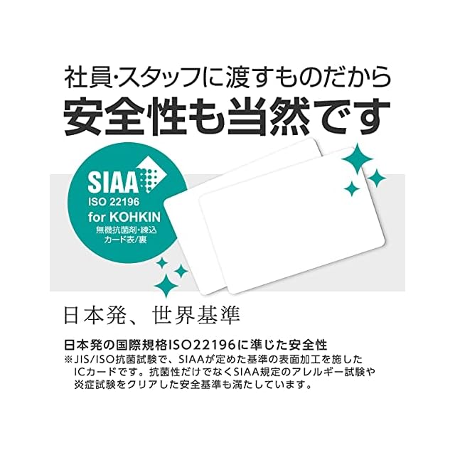日本発の国際規格ISO22196に準じた安全性。JIS/ISO抗菌試験でSIAAが定めた基準の表面加工を施したicカード。抗菌性だけでなくSIAA規定のアレルギー試験や炎症試験をクリアした安全基準も満たしています。