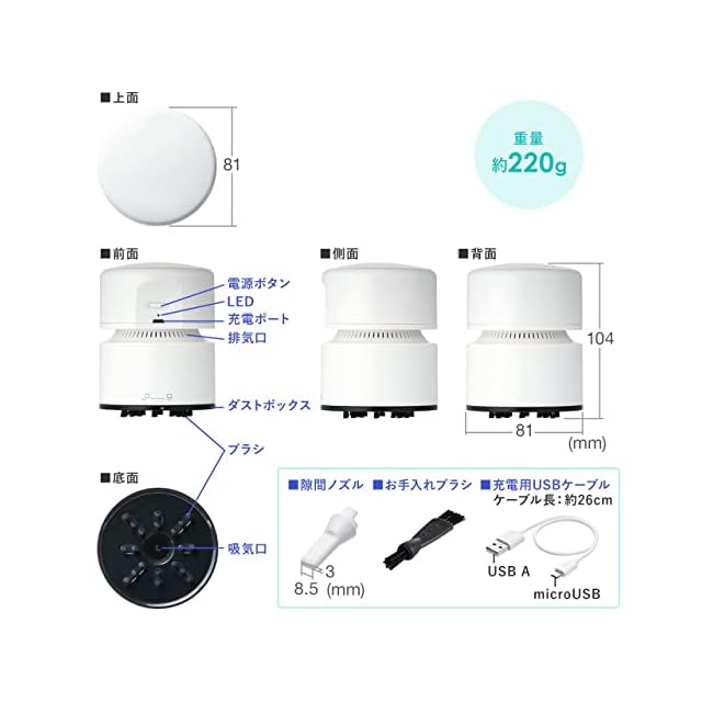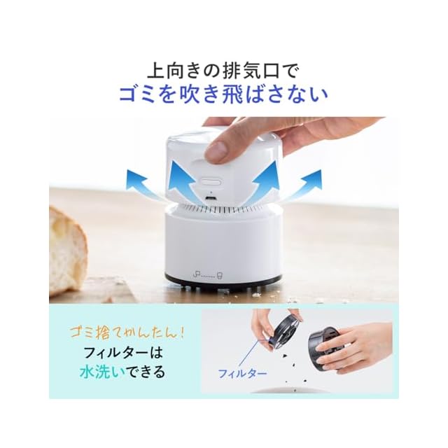 ごみ捨ては、上カバーを外すだけで簡単に捨てることができメンテナンスが楽です。中のフィルターの部分は水洗い可能です。● USB充電式 で繰り返し使用できます。充電はパソコンのUSBポートや別売のAC充電器から可能です。