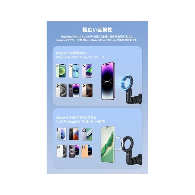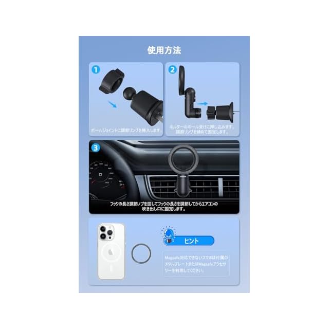 幅広い互換性:金属フックの固定方式を採用したエアコン用車載ホルダーです。水平・垂直・斜め型吹き出し口に取り付けできます。フックの長さが約1~3.3cmまで調節できるので、ほとんどの車種に適応します。また、Magsafe対応のスマホ(iPhone 12シリーズ以降)はホルダーを置くで直接に吸着可能だけではなく、Magsafeアクセサリ一を利用して、Magsafe対応ないのスマホも使用可能です。【ご注意:Magsafeスマホケースを使用した場合は付属のメタルプレ一トを使用しないでください。】