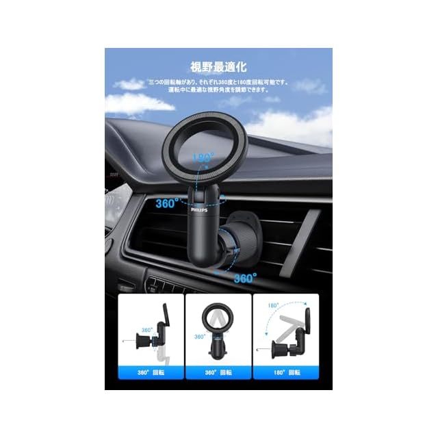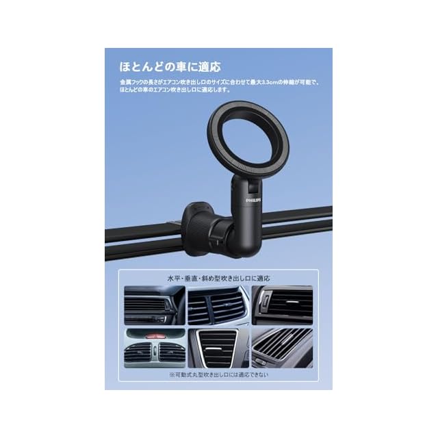 Philips (フィリップス) 車載スマホホルダー マグネット エアコン 吹き出し口 金属フック magsafeホルダー 超強磁力 瞬間吸着 360°回転可能 マグセーフ携帯ホルダー 片手操作 コンパクト設計 車用ホルダー カー用品 ほとんどの車種/機種対応 DLK4231B