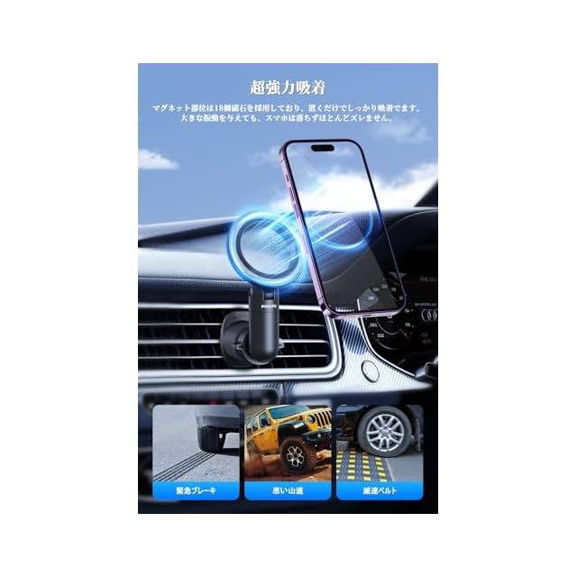 瞬間吸着:カーホルダーのマグネット部位は18個の磁石が均等に配置されることで、スマホを全方向から支えることができます。スマホが0.1秒で瞬間吸着でき、しっかりと固定できます。どんなに振っても勝手に落ちません。緊急ブレーキや減速ベルトなど場合にもスマホが安定して保持します。運転中でスマホが落ちるリスクが大幅に減少し、安心して使用することができるホルダーです。