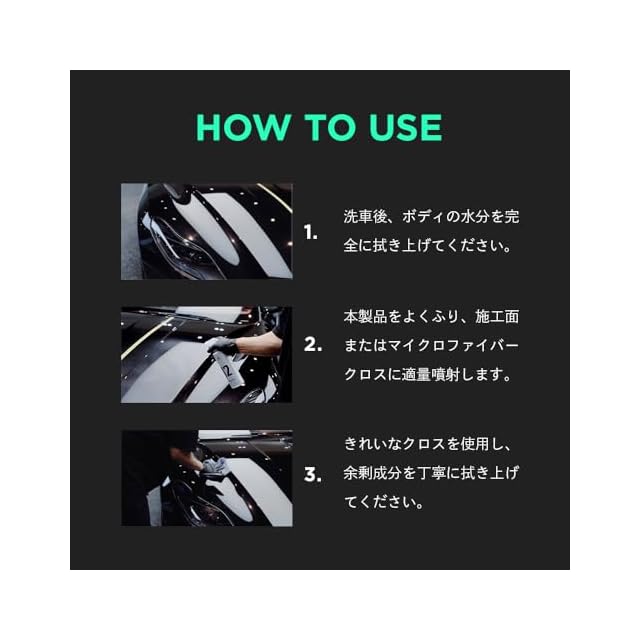 【使用方法】1:表面の水分を完全に取ってください。 / 2:使用前に製品をよく振ってからボディに適量吹きかけ、乾いたきれいなタオルですぐに拭き上げてください。 / 3:4時間で硬化開始し、24時間で完全に硬化します。施工後12時間はなるべく水に濡れないようにしてください。