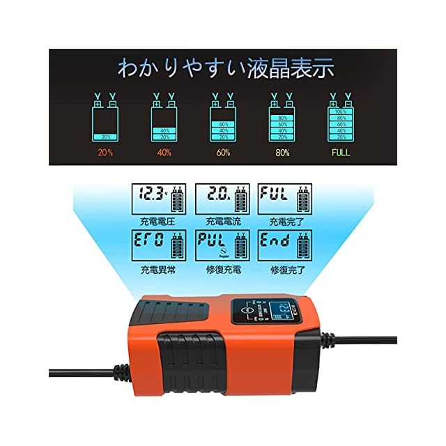 ★わかりやすい液晶表示★:充電電圧、充電電流、充電状況を表示されて、バッテリー充電量も確認てき、エラの場合も注意してくれて、簡単に把握できます。
