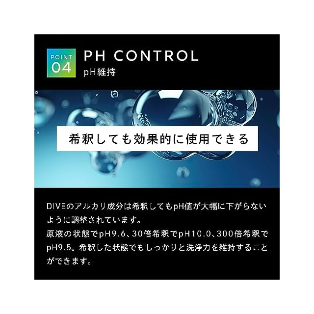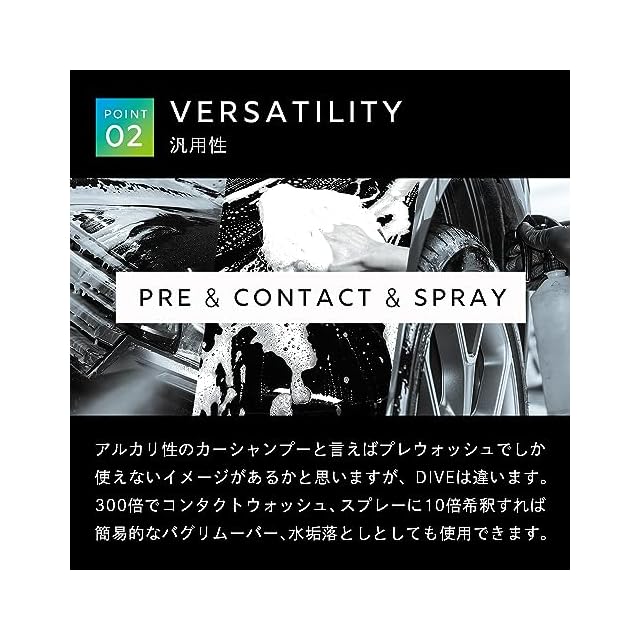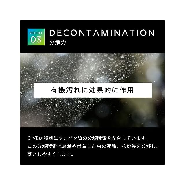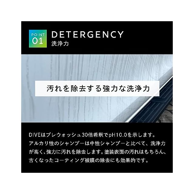 【アルカリ性】DIVEは高い洗浄力があり、通常での洗車では取れない汚れも強力に除去します。タンパク質分解酵素を配合し、鳥フンや虫汚れにも高い洗浄力を発揮します。
