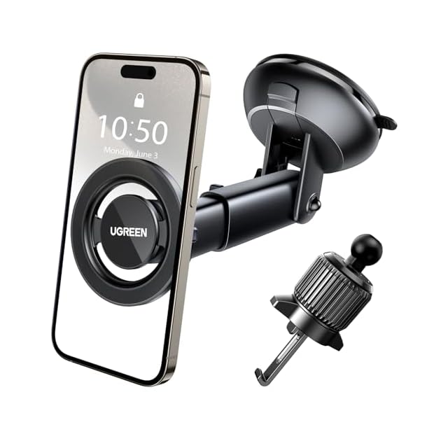 【超強磁性マグネット、1秒で着脱&片手操作】UGREEN 2in1マグネット式車載ホルダーはN52の強力な吸着力を持ち、デコボコ道や急カーブ、急ブレーキでもしっかりスマホデバイスを吸着し落下させません。優れた安定性をもたらす上、磁気によるスマホの電波や機能に干渉せず、スムーズに通信が可能です。magsafe充電機能にも影響がありません。