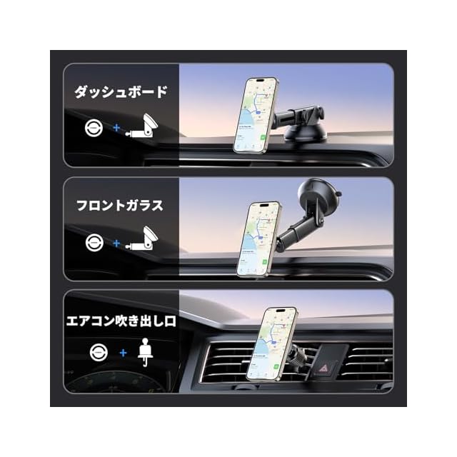 【2-in-1 magsafe対応スマホホルダー】 吸盤式&送風口式両用の超便利なデザインで、吹き出し口式だけではなく、ゲル吸盤式ホルダーとしてダッシュボード、フロントガラスで簡単に装着して使用できます。ご注意:ワイヤレス充電に対応しません。