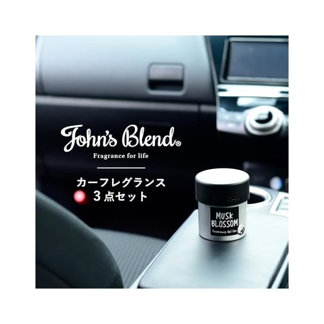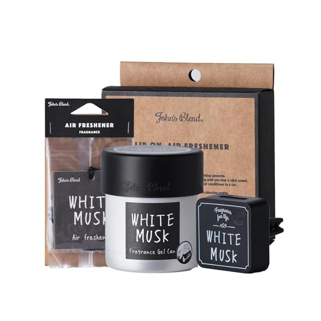 ●「いい香りで日々の暮らしをもっと豊かに」という思いから生まれた John's Blend シリーズ<br>●車の芳香剤、吊り下げ・クリップ・ジェルカンをまとめたカーフレグランスセット。車内をホワイトムスクの心地よい香りで満たします<br>●サボン系の爽やかさとホワイトフローラルのほのかな甘みがクセになるホワイトムスク。どこか懐かしさも感じられる優しい香調は、男女問わずお使いいただけます<br>●芳香持続期間:吊り下げ(約2~4週間)、クリップ(約30日間)、ジェルカン(約4~5週間)