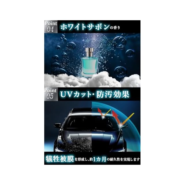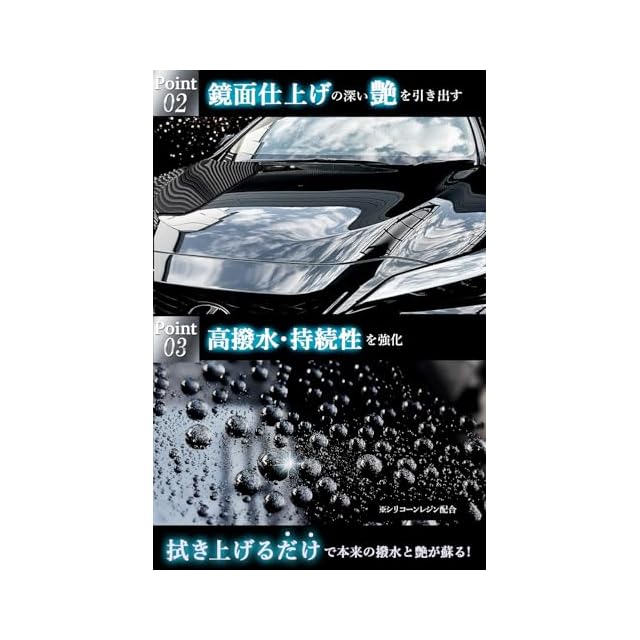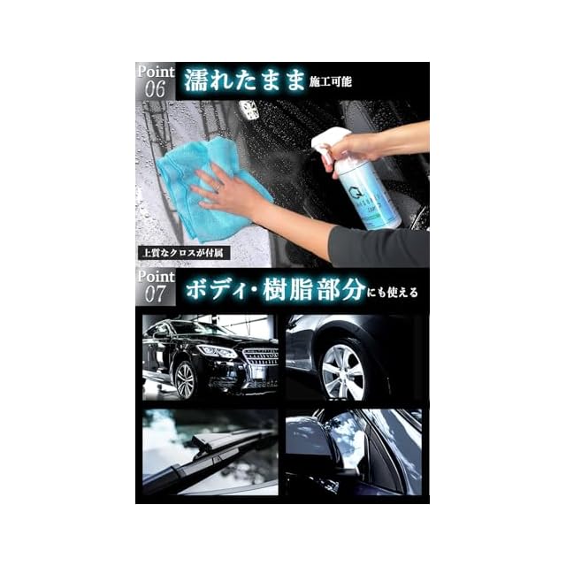 ✅【艶・撥水、あるべき姿へ。】濡れたままでも施工可能。シャンプー洗車だけでは落としきれなかった細部の汚れや、軽度なスケールもスッキリ除去。シリコーンレジン使用で持続性と撥水性UP。スプレーして拭き上げるだけで本来の美しい艶と撥水が手軽に実現。洗車後の仕上げにぴったりな抜群の施工性。