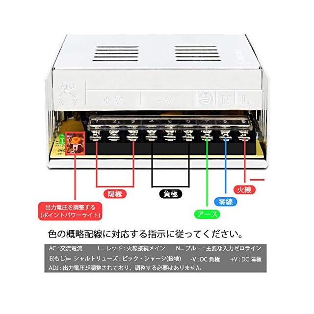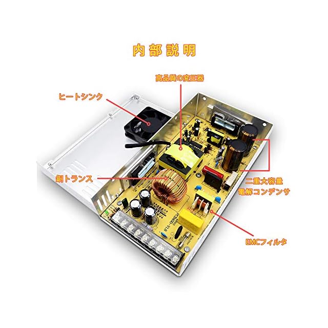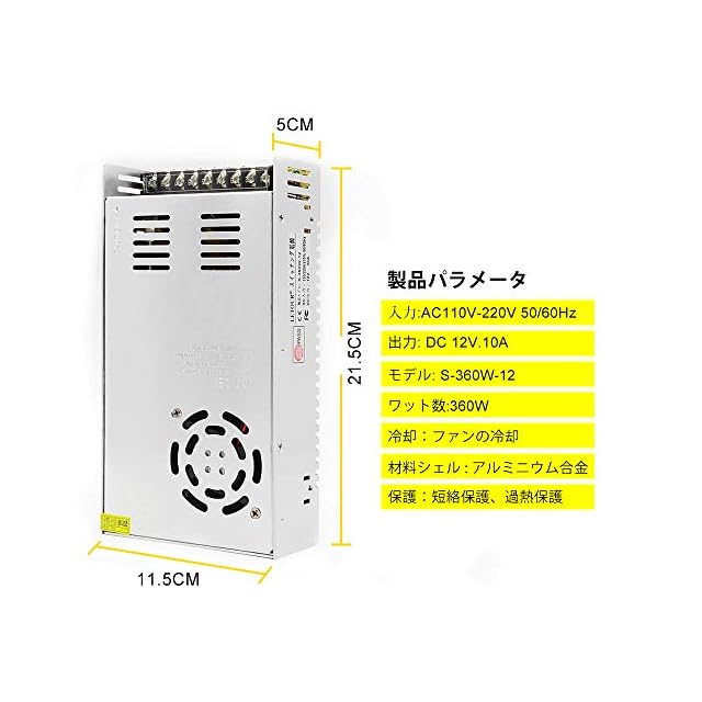 【品質】入力 :AC110V~220V 50/60Hz。出力: DC 12V 30A。モデル:S-360W-12。ワット数 : 360W、効率:85%。起動時間:≦1S(110V 入力、Io=100%)。保管温度:-40℃~80℃。作業温度:10℃~40℃/10%RH。サイズ: 21.5cm×11.5cm×5.0cm。材料シエル :アルミニウム合金。弊社は2年間の品質サービスとそれなりの技術サポートを提供しております。何か質問があたっら、7日*24時間に弊社と連絡してください。