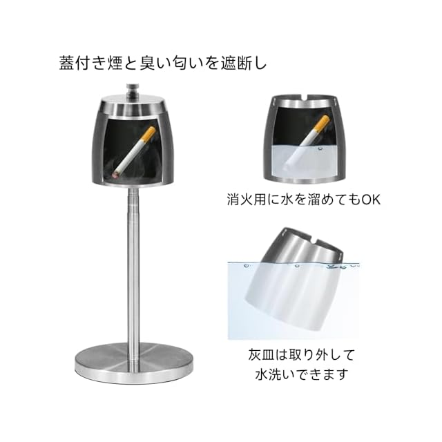 灰皿はサイズ:10cm*10.2cm*8cm があります。コンパクトだけど大容量!約4〜5箱程度の吸い殻をストックできる大容量です。<br> 本体の中にはレストがありますので、タバコの仮置きや火を消すことができます。いっぱいになっても気密性があるので臭い漏れも気になりません。<br> 【安全&気密性バッチリ】灰皿部は、しっかり囲まれて作られているので、風のせいで灰が飛ぶことがありません。蓋を閉めればタバコの火もすぐに消せます。また灰皿内部には、消火用の水を貯めることができます。<br> 【高さ調節可能&組み立て簡単】自由に高さ調節できる「伸縮灰皿スタンド」です。 ベランダで立ち、ソファに座るなどシーンに合わせた使い方ができます。約35cmー67cmに高さ調整可能ですので、お好みの高さに調整できます。<br> 【お手入れ方法】丸洗い可能なステンレス素材を使用しており、開口部も広いので簡単に吸い殻を捨てることができます。部品も少ないのでお手入れは非常に簡単です。<br>