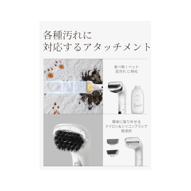 【新設計のクリーニングヘッド】アップグレード版リンサークリーナーではフロントノズルを採用、清掃がより直感的で便利になりました。水量を精密にコントロールでき、過剰な噴霧や乾燥時間の短縮に役立ちます。9cmのブラシヘッドは特別に設計され、吸引力を強化し、頑固な汚れを効果的に除去します。隙間用ノズルとペットに優しいクリーナーと組み合わせて、様々な清掃ニーズに簡単に対応できます。