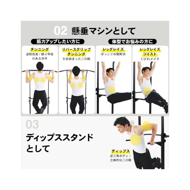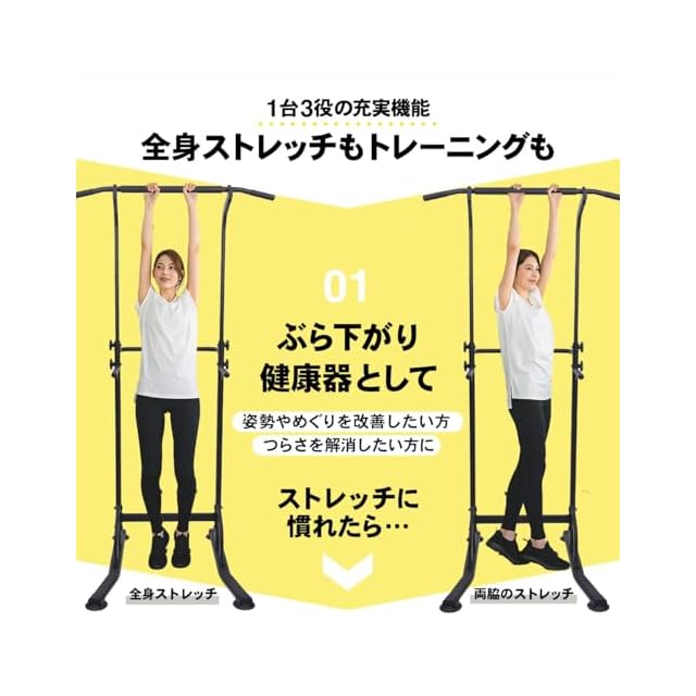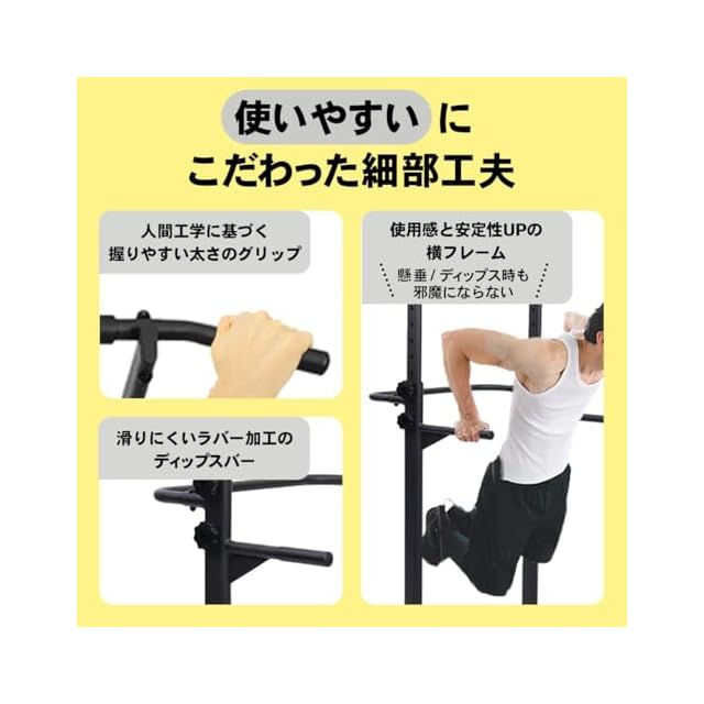 【握りやすいディップスバー】ぶらさがりやストレッチだけでなく、1台で筋トレもしたいというニーズに応えるべく、ディップスバーも搭載。懸垂バーとしてはもちろん、上半身を効率的に鍛えることができるディップススタンドとしての機能も併せ持つことで、自宅で頼り甲斐のある背筋や分厚い大胸筋を目指せます。コンパクトなホームジムを持ちたい方にも最適です。