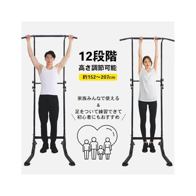 【家族みんなで使える12段階の高さ調整】高さ調節が12段階で可能なため、お子様から高身長の方まで最適な高さで使え、また初心者の方は床に足がつく高さで懸垂の練習ができます。ぶら下がりはコツいらずでどなたでも簡単に行えるため、ご家族全員の健康 / 正しい姿勢づくりにおすすめです。