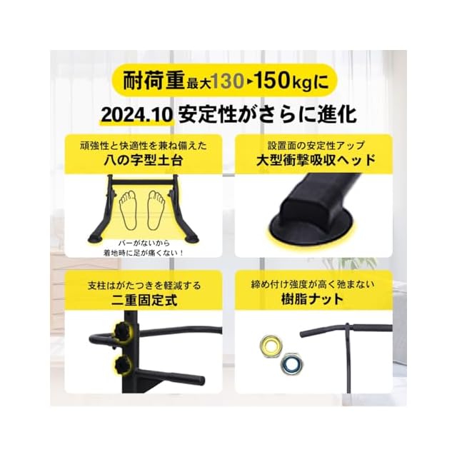 【2024年10月update/安定性が革新進化】ぶら下がり健康器において重要な安定性への追求を深め、八の字型の土台と大型のネジによる二重固定式の支柱を採用。また、大型衝撃吸収ヘッドをさらに大きく強化したことで、耐荷重が最大130kg→150kgにパワーアップしました。懸垂やぶら下がりの際の安定性と安心感が革新的に進化した次世代モデルです。