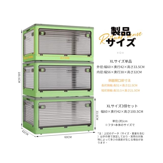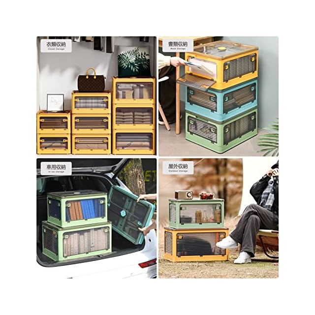 【組立簡単▪積み重ね】折りたたみ式なので、ツールなしで簡単に組み立てます。使用しないときは折りたたんで収納できます(高さ7cm)、車内や室内のちょっとした隙間に置くことができます。溝が付いているので、積み重ねて使用することで、効率よく収納スペースが活用できる収納ボックスです。側面から物が取られる、何段が積まれていても箱を運んで物を取る必要がありません。側面扉から開けて物を取りやすい、時間もかかりません。