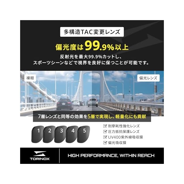 TORINOX(トリノクス)のサングラス(偏光レンズ、軽量設計)はメンズ、レディース問わず、普段使いから運転や釣り等まで幅広くお使い頂けるこれまでに無かったコンセプトのスポーツカジュアルサングラスです。コストと品質(偏光レンズ、UV400、軽量設計)のバランスを重視しアクセスしやすい金額設定でありながら長期間の使用に耐える耐久性とスタイルで運転、釣り、自転車、ドライブ、ロードバイク、野球、ゴルフなどのシーンに対応します。