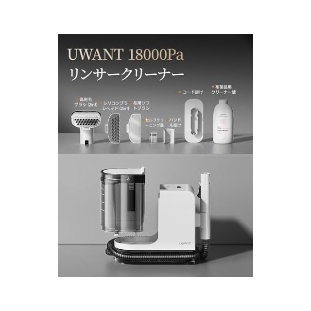 【核心技術の革新 18000Pa超強吸引力】uwantリンサークリーナー 600W強力モーター搭載カーペットクリーナー アタッチメントセット付き(3つのプロ仕様のブラシヘッド+布製品専用洗浄液) 2-in-1大容量水タンク絨毯クリーナー 車シートと布製品洗浄 マットレス/ペット用シート/車内/ソファ/ぬいぐるみ/カーペット/掃除用品