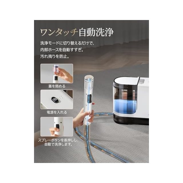 【自動クリーニング 】uwant スチームリンサークリーナーは自動ホース洗浄機能を搭載しており、掃除が終わった後にホースキャップを閉じて自動洗浄モードを起動するだけで、残った汚れや水分をすばやく除去し、ニオイや細菌繁殖を防ぎます。