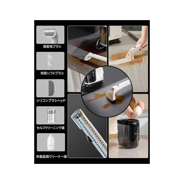 【5種ブラシで家中キレイ!】本製品は5種類の専用ブラシヘッドを装備し、ソファやカーペット、マットレス、カーテン、レザー素材、キッチンのコンロ周りなど、さまざまな素材・場所に対応。汚れの種類に合わせて設計されたブラシで、しっかりと奥まで深く清掃し、高い洗浄効果を実現します。