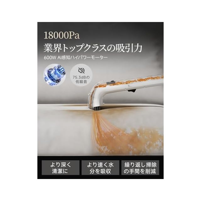 【600Wモーター&18000Pa爆吸力】アップグレードされた600Wの高性能モーターを搭載し、吸引力を大幅に向上。頑固な汚れや目に見えないほこりも深く吸い取り、ソファ、カーペット、車のシートなど、さまざまな布製品を素早く徹底的にクリーニングできます。