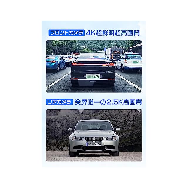 【前4K+後2.5K高画質+高感度IMXセンサーWDR/HDR+前後2カメラ同時録画】 ➊本機には4Kフロントカメラと2.5Kリアカメラが搭載されており、ナンバープレートや標識の文字など細部まで鮮明に記録可能です。特に夜間の撮影性能も強化されているので、万が一の時にはしっかり証拠が残されます。➋本機には高感度IMXセンサーが搭載されており、HDRおよびWDRの画像補正技術により、暗い環境でも鮮明な映像を記録することが可能です。曇り/雨などの悪天候や夜間でも、鮮明で美しい映像を記録!黒つぶれや白飛びを防止。夜間やトンネルで明度差のある場面でもしっかり補正して、鮮明な映像を記録します。❸前後2カメラ同時録画であなたの前方と後方をしっかり守ります。
