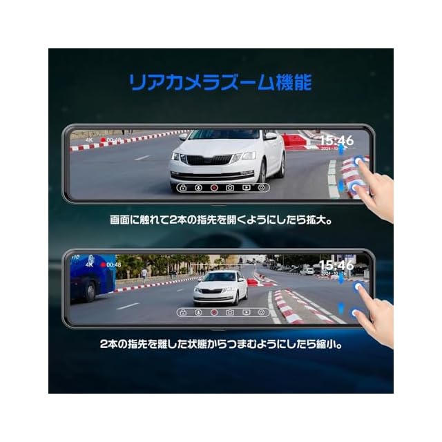【リアカメラズーム機能と様々な新機能を追加】リアカメラにはいよいよズーム機能が追加されました。指二本で画面を拡大/縮小することができます。お客様の使用をより便利にするために、お客様のフィードバックに従って、多くの実用的な機能を開発およびカスタマイズしました。超速警告、 バック連動、バックガイド線角度調整、リアカメラ映像上下/左右反転、日付表示/非表示、GPSオン/オフ、起動音調整、リアカメラに自動切り替え、露出度調整、スクリーンセーバーなどさまざな機能が追加されており、使い勝手が大きく向上!