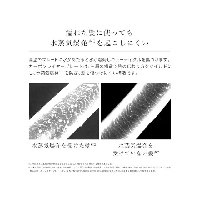 【濡れた髪に使っても 水蒸気爆発※1を起こしにくい】高温のプレートに水があたると水が爆発しキューティクルを傷つけます。カーボンレイヤープレートは、三層の構造で熱の伝わリ方をマイルドにし、水蒸気爆発※1を防ぎ、髪を傷つけにくい構造です。