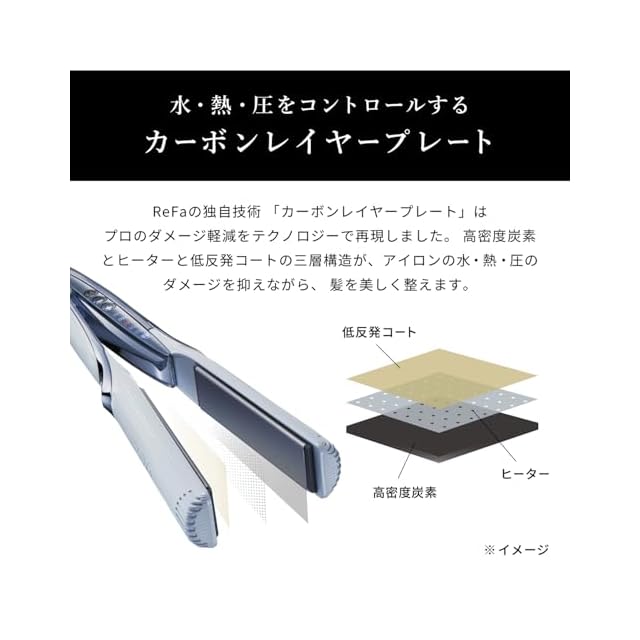 【水・熱・圧をコントロールする カーボンレイヤープレート】水・熱・圧のコントロールは、ダメージを起こさないケアに大切な要素。髪に水が残ったまま熱をかけると水蒸気爆発※1が起こり、キューティクルを傷つけます。さらに高温での圧を何度もかけることは、髪がつぶれる原因に。プロフェッショナルは、ダメージを抑えるためにアイロンを動かす速さやテンションを細心の注意でコントロールしながら髪を整えています。ReFa の独自技術「カーボンレイヤープレート」はプロのダメージ軽減をテクノロジーで再現しました。高密度炭素とヒーターと低反発コートの三層構造が、アイロンの水・熱・圧のダメージを抑えながら、髪を美しく整えます。 ※1 水が非常に温度の高い物質と接鮎することにより気化されて発生する爆発現象のこと。