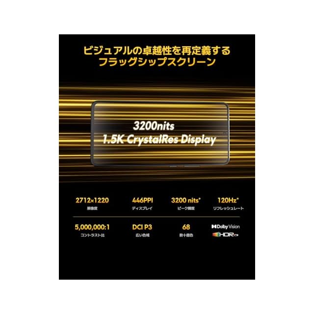 ✅6.67インチの高精細1.5K(2712×1220) CrystalResディスプレイ。最大輝度3200nitsを実現する新しい発光素材を採用し、リフレッシュレートは最大120Hzに対応しています。ゲームや映像もなめらかに表示し、優れた視覚体験を提供します。