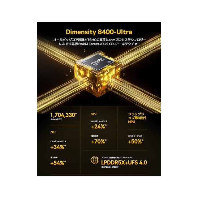 ✅ハイエンド級のチップセット搭載。オールビッグコアCPUアーキテクチャ、フラッグシップレベルのGPU、業界最先端のAIエンジンを採用した最新のハイエンドチップMediaTek Dimensity 8400-Ultraを日本初搭載。