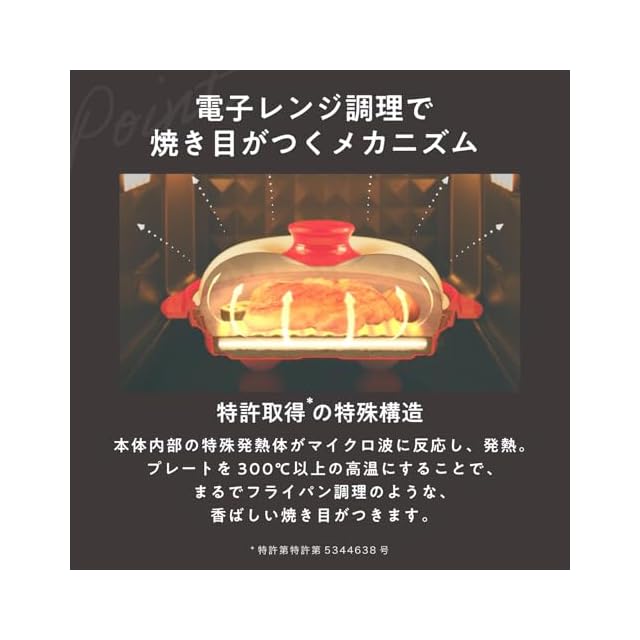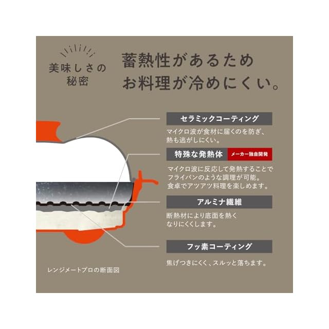 【電子レンジで直火のような調理】一般的なマイクロ波による直接的な摩擦熱での温めに比べレンジメートプロならセラミックコーティングのフタが直接食材にあたることを防ぎ、 本体内部のプレートが発熱することえ焼き目がつきます。