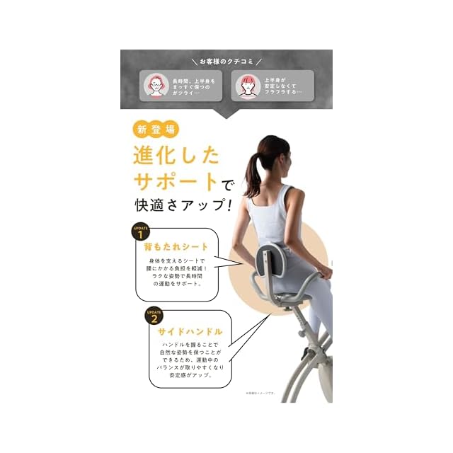 【進化したサポート機能】進化したサポートで快適さアップ!背もたれシートが腰にかかる負担を軽減し、ラクな姿勢で長時間の運動をサポート。さらに、サイドハンドルを握ることで自然な姿勢を保つことができるため、運動中のバランスが取りやすくなり安定感がアップします。