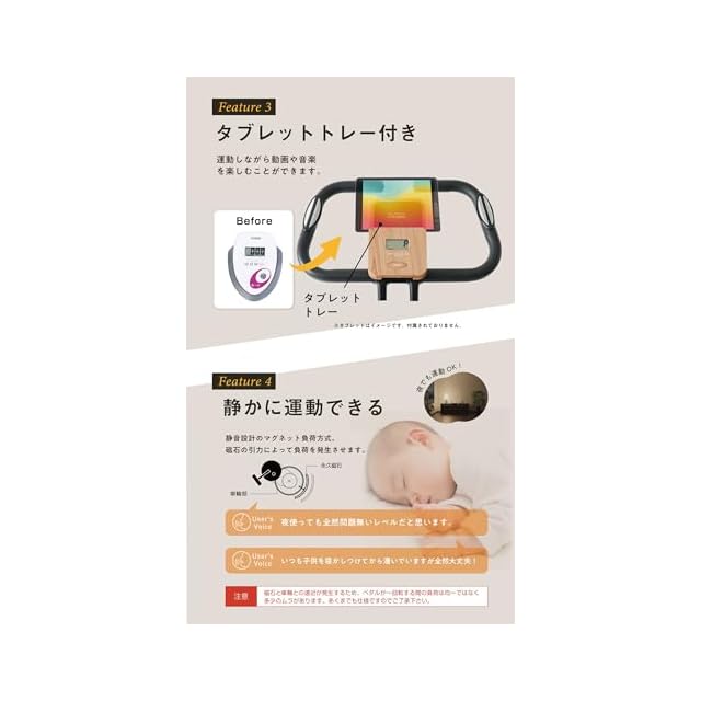 【商品仕様】サイズ:(使用時)=幅53×奥行106×高さ113cm、(折り畳み時)=幅53×奥行46×高さ140cm/重量:約16.5kg/サドル高さ調整:8段階(L755-H855mm)/サドル前後調節:約40mm/使用体重制限:約90kg/適応身長:約150-180cm/負荷方式:マグネット負荷/負荷調節:8段階/付属品:単3乾電池×2本/材質:スチール、ABS、PP、PVC、、PU/カラー:ウッド/期間:1年