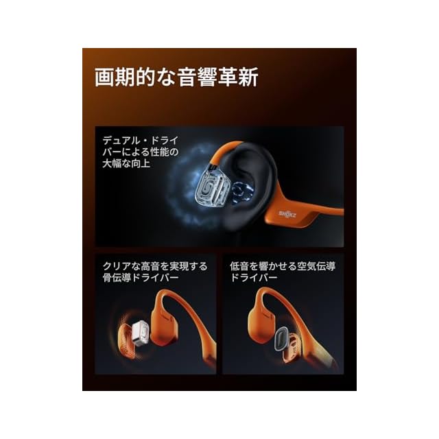 デュアルドライバー、優れたサウンド - Shokz DualPitchを搭載し、オープンイヤーオーディオのルールを書き換えるShokzのまったく新しいフラッグシップヘッドフォン、OpenRun Pro 2をご紹介します。この新しいテクノロジーは、骨伝導スピーカーと空気伝導スピーカーの完璧なデュエットです。その結果、クリアでパワフルな比類のないリスニング体験が実現します。