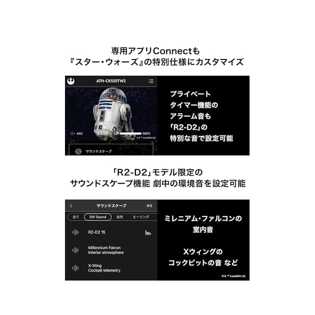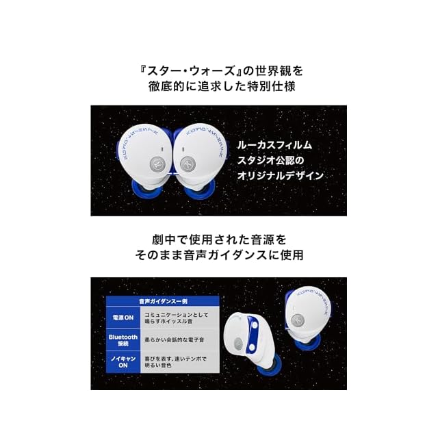 技適マーク認証済み商品(周波数帯:2.4G帯)『スター・ウォーズ』の世界観を徹底的に追及した特別仕様:今回のコラボレーションにあたり、ルーカスフィルムスタジオから特別にデザイン監修を受けて開発された公認プロダクトです。製品細部まで徹底的にこだわり抜き、『スター・ウォーズ』の世界観を再現しました。劇中で使用されている本物のオリジナルサウンドをそのままイヤホンの音声ガイダンスとして収録。起動時をはじめ、あらゆる場面で各モデルのキャラクターに関連するサウンドが楽しめます。
