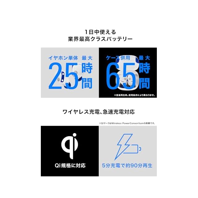 1日中使える、業界最高クラスバッテリー:ノイズキャンセリングOFF時では、イヤホンだけで最大25時間の連続再生が可能なため、 電池切れを心配することなく音楽や動画やSNSを1日中楽しむことができます。また、ノイズキャンセリングON時でも最大15時間、充電ケースを併用すれば最大65時間の連続再生が可能です。